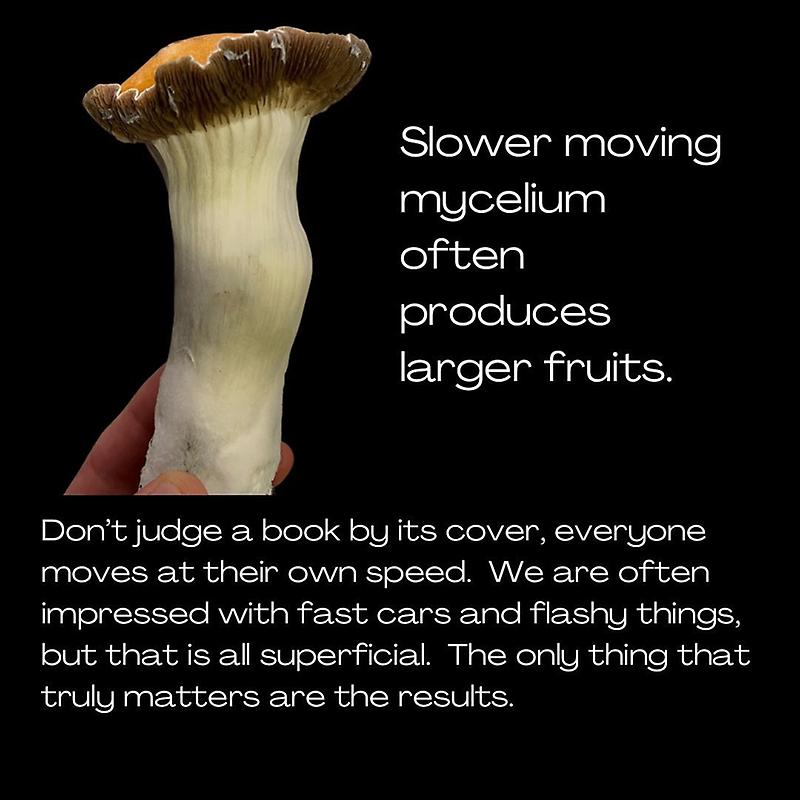 According to Jik Fibs, he was working with Albino Golden Teacher fruiting bodies when he noticed a peculiar, thick-stemmed mutation that kept growing even after the veil broke. Shocked by its unusually large, solid fruiting body he decided to let it continue maturing.