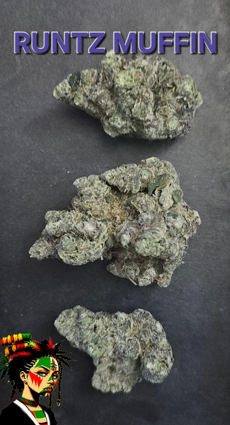 Runtz is an evenly balanced hybrid strain (50% indica/50% sativa) created through a delicious cross of the infamous Zkittlez X Gelato strains. Named for the iconic candy, Runtz brings on a super delicious fruity flavor with tropical citrus and sour berries galore. The aroma is very similar, although with a sharp spicy pineapple effect that turns slightly pungent as the sticky little nugs are broken apart and burned. The Runtz high comes roaring in a few minutes after your final toke, first hitting your head with a calming lift before spreading its tingly tendrils throughout the rest of your body. As the Runtz high expands, you'll begin to feel a deeply calming effect spread through your limbs, leaving you totally sedated and couch-locked, immovable for hours and hours on end before you finally fall into a deep and peaceful sleep. Thanks to these effects and its super high 19-29% average THC level, Runtz is often said to be perfect for treating conditions such as insomnia, chronic pain, appetite loss or nausea and chronic stress or anxiety. This bud has dense grape-shaped olive green nugs with thin orange hairs, dark purple undertones and a coating of frosty tiny white purple-tinted crystal trichomes.